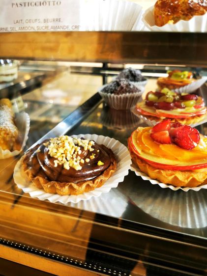 Pari gagné, Simona est soutenue par tout le monde (son mari, Dominique, a cru en ce projet dès le début et l’a beaucoup encouragée, de même que ses enfants, qui lui ont dessiné le logo) : six mois lui suffiront pour ouvrir sa boutique, épaulée par le Syndicat de la pâtisserie de Paris. Marinela Sufali, la pâtissière, répond à son annonce postée sur les réseaux sociaux. Elle qui a été formée à l’université de cuisine Alta Formazione Tione di Trento et qui a fait ses armes dans de grandes maisons (Monte Napoleone, chez Giovanni Ciresa puis à Paris), sensibilisée à la slow food, a un parti pris pour la pasticceria : utiliser moitié moins de sucre dans les recettes traditionnelles de pâtisserie italienne et par conséquent proposer de l’ultra-frais chaque jour. Il a aussi fallu bannir le saindoux, ingrédient traditionnel du pasticciotto (pâte sablée fourrée de crème pâtissière et cuite au four). On retrouve aussi dans la vitrine le mimosa (génoise, crème pâtissière, fraises ou ananas), la crostata di frutta fresca (tarte aux fruits), le sacher (clin d’œil aux origines du Nord de l’Italie de Marinela), le babà napolitain, le cannolo, la torta de la nonna (pâte sablée, crème pâtissière, pignons de pin et citron) et le caprese, un dessert sans lactose et sans gluten, composé de farine d’amande, d’œufs, de chocolat et d’huile d’olive. Chez Simona, vous pouvez déguster également de la focaccia faite maison (pâte composée de farine 00, de manitoba, de farine de semoule et de T55 préparée la veille sur poolish), des tramezzini, des panini et des millefoglie salés. Marinela propose chaque jour une recette différente, pour fidéliser ses clients au maximum. Mais avant tout, la clientèle passe le matin pour s’offrir un peu d’Italie avec l’excellent cappuccino et le cornetto (avec du café Vergnano, plus une touche de crème pâtissière café, pistache ou vanille dans le croissant) et pratiquer son italien.