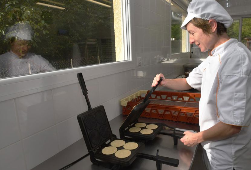 Géraldine aime d’autant l’histoire de ces bricelets qu’elle a découvert l’existence d’une personne qui en élaborait à Saint-Amour, il y a plus de 60 ans. Au Moyen Âge, déjà, on parle « d’oublie », une sorte d’hostie non consacrée, en forme de pain et servie lors de jeûnes ou de fêtes solennelles. Diverses déclinaisons en feront les bretzels allemands et une recette traditionnelle suisse : le bricelet, petite gaufre fine, cuite entre deux fers ciselés de motifs variés. Géraldine a commencé à produire ces petites gaufres, d’abord dans sa cuisine « en étalant la pâte avec un rouleau », avant de mettre en place son labo il y a un an, avec tout le matériel adéquat : laminoir, pétrin et « des fers de la marque Jura dont la fabrication a maintenant cessé ». Un investissement total de 100 000 €, qui lui permet de répondre à la demande de son réseau de distribution : « essentiellement des épiceries fines, des magasins de fruitières à comté et des traiteurs qui représentent 90 % du chiffre d’affaires, le reste provient de la vente directe aux particuliers ».