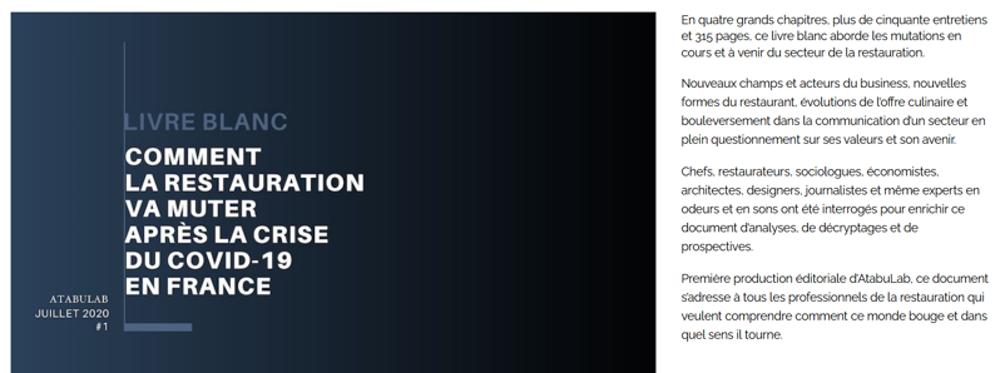 Des événements (petits-déjeuners, dîners…), mais aussi une production éditoriale avec son premier livre blanc publié le 6 juillet «Comment la restauration va muter après la crise du Covid-19 en France» (payant) seront donc à l’ordre du jour d’Atabulab : autant de leviers d’action à la hauteur de ses ambitions.