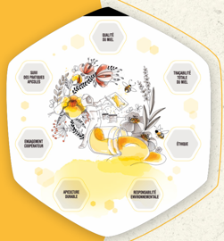 Il reflète l’exigence et le savoir-faire d’apiculteurs professionnels engagés dans une charte de production pionnière et démontre qu’il est possible de concilier respect des abeilles, des producteurs et des consommateurs en devenant le premier miel issu du commerce équitable français certifié Agri-Éthique.