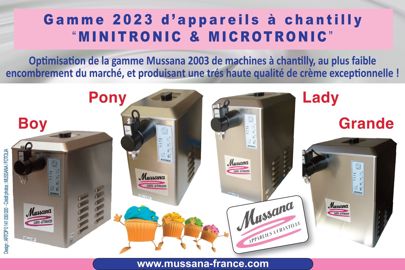 Acteur majeur dans la fabrication d'appareils à chantilly et dérivés, Mussana France innove en permanence afin de proposer des appareils toujours plus performants pour répondre aux besoins des métiers de bouche et des professionnels du secteur de l'hôtellerie, de la restauration et des cafés (Horeca). La société optimise de nouveau ses gammes vedettes, au plus faible encombrement du marché, de mini-appareils Minitronic (modèle Pony) et Microtronic (modèles Boy, Lady et Grande) pour les rendre encore plus performantes et obtenir une crème chantilly toujours plus onctueuse.