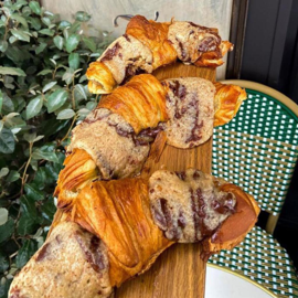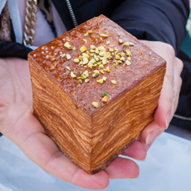 Le croissant cube a tout du classique — sa délicieuse pâte feuilletée —, la forme cubique en plus ! Mais ses atouts sont ses savoureux fourrages (pistache, noisette, etc.) et ses nappages colorés. À chaque artisan de customiser ses créations et de faire preuve d’originalité.