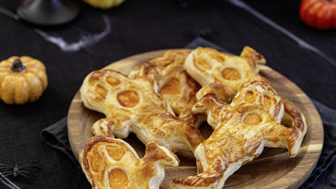 Déposer vos fantômes sur une plaque de cuisson tapissée de papier sulfurisé. Badigeonner les feuilletés avec le jaune d’œuf, puis enfourner pendant 12 min.