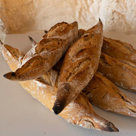 « Pour les baguettes — divisées et façonnées manuellement —, on préfère un levain liquide », précise-t-il. En pleine saison estivale, il en fabrique près d’une centaine par jour ! Baptiste a mis au point des croissants de forme octogonale. Il utilise des cercles en inox pour mouler les focaccias, garnies de tomates cerises confites ou d’olives vertes. Les brioches individuelles sont fourrées d’un cœur praliné maison ou d’un cœur ganache chocolat au poivre de Timut népalais.