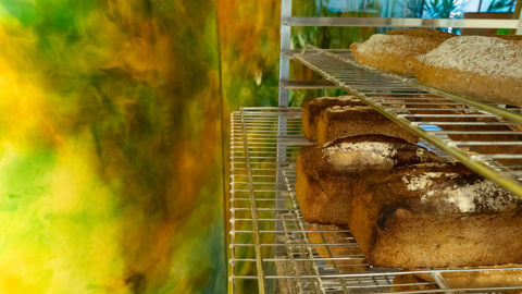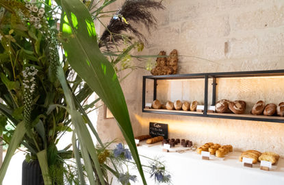 « J’ai aussi remis les boulangers au centre de la boulangerie », ajoute-t-il. Dès l’entrée, on peut en effet voir le four et les échelles sur lesquelles refroidissent les cuissons. Derrière de hauts séparatifs en verre, Baptiste termine les préparations du matin. Il trempe un bretzel provençal parfumé au romarin dans l’eau bouillante bicarbonatée, l’en ressort rapidement, puis parsème le dessus de morceaux de Pélardon (fromage de chèvre local) avant d’enfourner. Du miel apporte la touche sucrée finale.