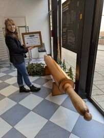 On accède au musée par un magnifique escalier en pierre, dont le drapé évoque les replis d’une pâte souple. Première découverte insolite : un rouleau à pâtisserie aux dimensions impressionnantes qui date de 1993 et figure dans le Livre Guinness des records. Puis, sur deux étages, sont regroupés matériels, ustensiles, outils, moules en terre cuite. Au mur, des sacs de farine décorés portent les prénoms de futurs mariés : ils figuraient sur les listes de cadeaux de mariage, comme il était d’usage autrefois. Une boulangerie à l’ancienne a même été reconstituée.