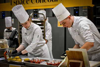 Dans la catégorie Jeunes Talents (élèves en formation de moins de 21 ans qui ne concourraient que pour l’épreuve de la religieuse contemporaine), Jeanne Boisselier (à g.) (Institut Lyfe à Ecully, Rhône) s’est illustrée avec sa création d’une religieuse café, pomme et fleur d’oranger. Elle est étudiante en bachelor pâtisserie et management.