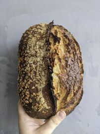 Fan de goûts complexes, le boulanger québécois mélange les farines bio de six moulins différents. Son pain de campagne est ainsi composé de farine blanche, farine de blé entier, farine de seigle intégrale, miel, eau, sel et levain. Et tous les samedis, il propose son pain avoine rôtie : farine blanche, farine de kamut, flocons d’avoine rôtis, sirop d’érable, eau, sel et levain.