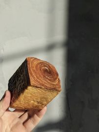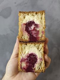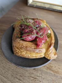Côté viennoiseries, Renaud repère sur un compte Instagram asiatique le fameux croissant cube. Comme le moule est cher, le boulanger trouve sa propre solution. Pour l’insert, il prépare des griottes confites, un sirop en gelée et un crémeux. « Toutes les deux semaines, nous changeons de saveurs : une compotée maison de fraises, des pêches au gingembre, une compote de rhubarbe fraîche, un crémeux au thé vert et jasmin, etc. » ajoute Mélanie.