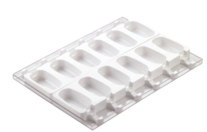 Fabriqué en Italie, le moule en silicone contient douze empreintes d’une capacité de 93x48,5x25 mm (80 ml de volume).