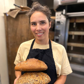 Chaque jour, elle fabrique son pain 100 % au levain en direct, pour une ouverture des ventes à partir de 16 heures. Le pétrissage démarre vers 6 heures, suivi d’un pointage en bac à température ambiante. Après façonnage, il faut compter environ sept heures de pousse (plus ou moins une à deux heures, suivant les conditions et la saison) sur des toiles à couche en lin dans le parisien (sur roulette), stratégiquement positionné à côté du four pour favoriser la fermentation et faciliter l’enfournement.