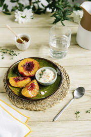 Par assiette, dresser deux demi-pêches, deux cuillerées à soupe de crème, une pincée de piment d’Espelette et quelques feuilles de thym frais