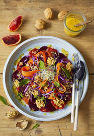 Dans un plat de service, disposer harmonieusement le sarrasin sauté aux brisures de noix, les rondelles de betteraves, les tranches d’oranges, le chou rouge émincé, le mesclun et les graines germées.