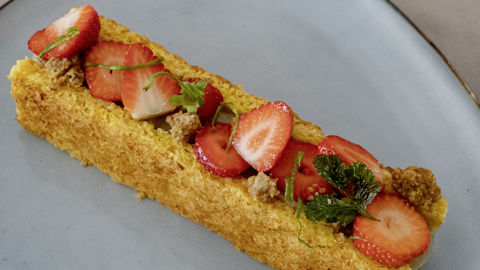 Laisser refroidir la préparation mais avant qu’elle ne devienne solide, la couler dans le cadre de 10 x 20 cm, au-dessus de la couche de confit de fraises.