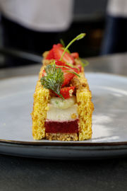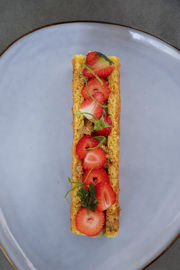 Avec la poche de confit citron coriandre et piment, garnir le haut du gâteau entre les deux bandes de biscuit.