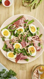 Dresser la salade en plaçant les asperges, puis les tranches de jambon de Bayonne Bonneterre coupées en morceaux, les œufs et verser la vinaigrette avec les échalotes marinées.
