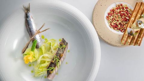 Passer le maquereau au chalumeau, le déposer sur la purée de fenouil et les copeaux, a côté, déposer la sardine avec l’arête croustillante, le tonneau de concombre et une fleur de concombre.