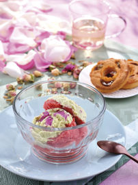 Au moment de servir, démoulez les rosaces de glace rose-pistache. Servez-les rapidement dans de jolies coupes en verre avec les biscuits à la rose.