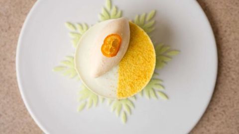 Pochez le confit de kumquats au centre, puis versez l’appareil à cheesecake au wasabi jusqu’au ras bord.