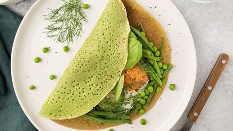 Garnir chaque crêpe de légumes, déposer un œuf au plat et replier en portefeuille.