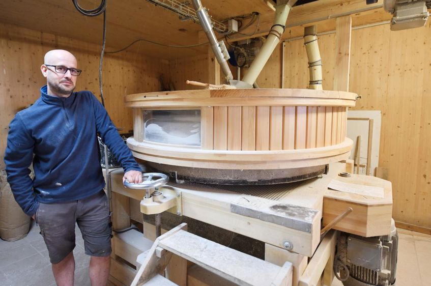 Benoit a construit lui même cette meule d’1,50 m en 2003. Pour gagner en qualité et rendement elle est dotée d’un double cylindre. Cela permet aux grains d’être moins longtemps dans la meule donc de moins chauffer JEAN-PIERRE AMET
