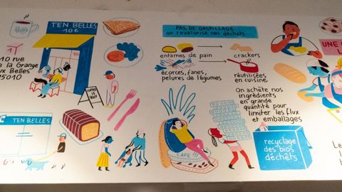 L’équipe Ten Belles est animée par des valeurs sociétales et environnementales fortes. Pour expliquer aux clients ce qui est important à ses yeux, une grande peinture murale a été conçue par l’artiste Camille de Cussac, en hauteur au-dessus des vitrines. Celles et ceux qui patientent d’être servis peuvent lire : « cuisine de saison locale et bio » - « le pain est façonné à la main » - « pas de gaspillage, on revalorise nos déchets » - « on achète nos ingrédients en grandes quantités pour limiter les flux et emballages »…
