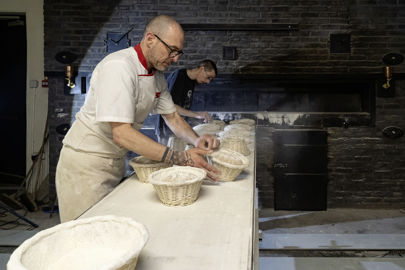 Dans la forêt qui entoure la manufacture, les oiseaux chantent. Le jour pointe quand Corentin et Yoann chargent la camionnette de livraison. Lucas a méthodiquement terminé les pesées et les courts pétrissages. Dans les bacs, il effectue des rabats. Il partage et pèse des pâtons d’1 kg, puis façonne en volcan, comme le lui a appris Romain. Les arômes sauvages vont se développer tranquillement jusqu’à la nuit prochaine.