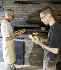 Luc Boulet est issu d’une lignée de boulangers et a été responsable pédagogique de l’Institut national de la boulangerie-pâtisserie (INBP) à Rouen. Pour ce projet, il s’est entouré d’une équipe de quatre boulangers — Romain, Yohann, Lucas et Corentin. Ils fabriquent, sur 500 m2, des pains et viennoiseries au levain, des biscuits et gâteaux de voyage au beurre fermier.
