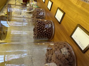 Le quebra quebrabiju est un chocolat agrémenté d’une recette de biscuit traditionnelle du sud du Brésil à base de farine de blé, qui s’apparente aux gaufrettes avec lesquelles sont confectionnés les cornets de glaces ; puis viennent les pepitas, de simples fèves caramélisées enrobées de chocolat noir 65 % ; ou les drageas, dragées fabriquées avec des noix de cajou torréfiées légèrement parfumées à la cannelle.