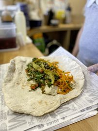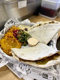 Le Juni peut être servi en rolls (8,50 €) ou à l’assiette (12,50 €), avec deux entrées (houmous, labneh, moutabal à l’aubergine, muhammara aux poivrons et aux noix) et deux salades (carottes, tomates ou taboulé aux herbes) au choix. Disponibles à l’unité à la carte, ces accompagnements sont aussi utilisés comme garniture pour les sandwichs à base de pain nature, relevés de pickles, herbes fraîches, et sauce maison parmi trois propositions : crème à l’ail, yaourt au piment et taratour, à base de tahini libanais (crème de sésame) et de citron.