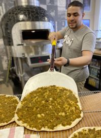 Deux options possibles : le pain est cuit nature pour servir ensuite de base de sandwichs, ou garni avant cuisson telle une pizza, baptisée lahmajun en Arménie. Best-seller du lieu, ce produit lui a donné son nom (voir photo ci-contre). « C’est un snack dont la naissance remonte à deux mille ans avant Jésus-Christ », relève le cuisinier, qui le décline en quatre garnitures : viande (bœuf et agneau hachés avec une marinade maison), légumes marinés, zaatar (mélange d’épices levantin) et trois fromages.