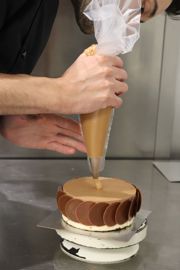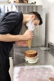 Face à une clientèle locale familiale et « plutôt traditionnelle », le monoproduit n’a pas décollé autant que prévu. L’offre s’est donc élargie avec des valeurs sûres de type vacherin et omelette norvégienne, et des créations plus originales. L’une des stars de ce début d’été est l’entremets glacé chocolat au lait-passion-cacahuète, qui associe de la glace, du crémeux, du biscuit croustillant et des palets fondants, pour un jeu de textures et de goûts. Tout ce qui est incorporé dans le gâteau est fait maison : biscuits, palets de chocolat, arachides pralinées…