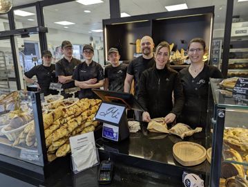 L’équipe est constituée de onze personnes dont le couple de patrons : trois en boulangerie — Jérôme, Antoine, et un apprenti —, Claudia et trois apprentis en pâtisserie, une préparatrice sandwicherie et 2,5 équivalents temps plein à la vente.