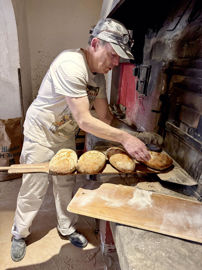 Après avoir retiré les braises qui ont chauffé la voûte et la sole du four en terre cuite, Manuel nettoie les cendres au balai et au jet d’eau. Puis, il pose sur la pelle en bois ses pains, qu’il grigne et enfourne un par un. La chaleur résiduelle accumulée offre une cuisson lente, four fermé. Les miches gonflent. Le boulanger les surveille tout en enfournant la suite. « Il n’y a pas de pain parfait, estime-t-il. Si je ne suis pas très content, je fais un prix à mes clients. Le pain ne devrait pas être un produit de luxe si l’on veut que les personnes en mangent régulièrement. » Ses pains bio aux farines paysannes et au levain sont vendus entre 5 et 10 € le kilo.