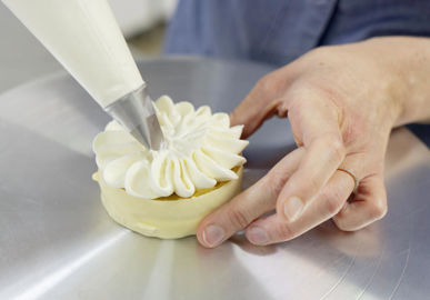 SG : À Cassis, j’ai connu le rythme de travail d’un magasin, et je sais que ce n’est pas la vie que je veux avoir. Mes enfants ont 7 et 10 ans, et le soutien de mon compagnon est très précieux. J’ai fait le choix d’un équilibre vie professionnelle-vie personnelle. Je ne réalise pas le même chiffre d’affaires que mes confrères, mais je suis là ! J’ai pérennisé mon activité sans me développer. Si l’entreprise grossit, l’artisan sort du labo. J’aime ça, rester au labo, c’est une fierté d’être artisan. Je travaille sur commande, avec un délai minimum de quarante-huit heures. Pour les événements, je prépare des gâteaux en deux bouchées, des gâteaux et des corbeilles de choux.