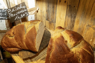 Du petit matin jusqu’à 10 h, le chaleureux abri en bois ne désemplit pas. Le présentoir est fourni, garni de pains nature au levain, aux graines, à l’huile d’olive, complets enrichis au son de blé, au petit épeautre 100 % ou 70 % moulés, etc. Debout derrière le comptoir, Sandra sert ses clients en pesant chaque pain. Elle vend également des sachets de farine de blé, de farine de petit épeautre, de farine de pois chiches ; des pois chiches, des miels issus des ruches de Jordan (son fils) et de Lucille (sa belle-fille). Côté salé : une pizza maison généreuse parfumée aux câpres, et la pissaladière aux oignons confits. Et côté sucré : des brioches à l’huile d’olive, des gibassiers ainsi que des croquants miel-amandes.