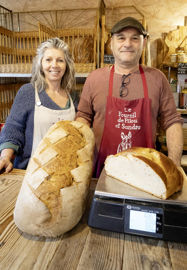 Lui-même avait débuté en cuisant ses premiers pains dans le four de sa maison ! « Je les enfournais quatre par quatre sans interruption pendant quarante-huit heures… Ensuite, j’ai transformé en fournil le garage chez ma mère, et je vendais mes pains sur place », précise-t-il. Les lundis et jeudis, le boulanger démarre le pétrissage à 16 h et termine les cuissons dans la nuit. La clientèle alentour a pris l’habitude depuis six ans de venir acheter des pains bio les mardis et vendredis à la boutique du Fournil de Pilou & Sandra. « Certains réservent par SMS, ou bien d’une semaine sur l’autre », explique cette dernière. Une étagère accueille une cinquantaine de pains commandés.