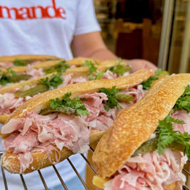 Il y a quelques mois, alors qu’Armande commence à rencontrer son public, les deux associés ont l’idée d’ouvrir une sandwicherie. « Il y a beaucoup de touristes à Montmartre et l’offre de snacking et de sandwichs de qualité nous paraissait maigre. Cela manquait d’une bonne enseigne de finger food [nourriture préparée pour être mangée avec les doigts, NDLR] ! » C’est comme cela qu’est née Armande Lepic, une sandwicherie artisanale installée dans la rue du même nom, au numéro 24. Côté décoration, pas de surprise, la convivialité est de mise, avec des meubles en bois et des carreaux de ciment façon zellige dans les tons bordeaux au mur.
