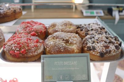 À côté de la dizaine de pâtisseries, trônent trois sortes de bressanes, des brioches plates typiques de la région : au chocolat, à la fleur d’oranger ou à la praline. Car le jeune chef aime mettre à l’honneur son terroir, aussi bien à travers la sélection d’ingrédients locaux que dans les recettes et les visuels : il propose, par exemple, une bûche de Noël représentant une tour de la célèbre basilique lyonnaise Notre-Dame de Fourvière. La chocolaterie n’est pas en reste, avec une vingtaine de tablettes, autant de bonbons chocolatés, ainsi que des fruits secs enrobés et pâtes à tartiner. Une courte gamme salée (trois recettes de focaccias garnies) est également proposée, uniquement dans la boutique d’Écully.