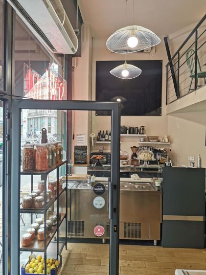 L’esprit cantine favorise le côté familial. Tout est fait-maison, sur place, à partir de produits bio et de saison. Il y a un petit espace vitrine pour la vente, une petite salle de restauration au rez-de-chaussée et en mezzanine.