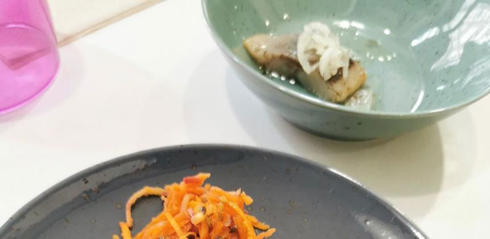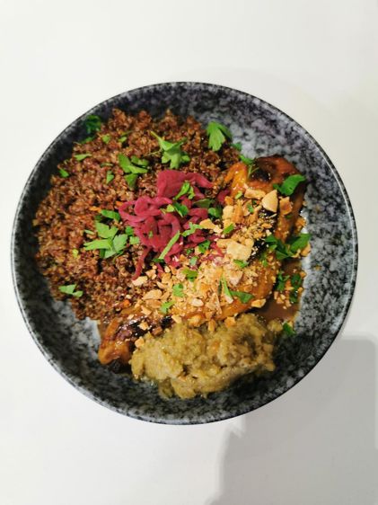 Les plats du jour sont tous composés de produits fermentés et agrémentés de produits de saison (ici cuisse de poulet mielmiso, caviar d’aubergines suris et quinoa).
