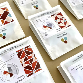 « Nous avons trois familles de cafés, avec des complexités croissantes intitulées : apprécier, explorer et déguster », indique Maud Petit, directrice marketing-communicationde Coutume. La première famille, aux arômes plus consensuels, ni trop acides ni trop amers, inclut des cafés accessibles à tous et pour tous les moments de la journée. Plus singuliers, les cafés des deux autres familles sont destinés en priorité à un public de curieux ou de connaisseurs. Apposée sur les packagings et les fiches de dégustation — disponibles en boutique comme en ligne — une roue chromatique résume la matrice aromatique de chaque référence (plus ou moins florale, épicée, sucrée, acidulée) et guide les clients, particuliers et professionnels, dans leur sélection, avec possibilité de personnalisation selon ses goûts.