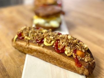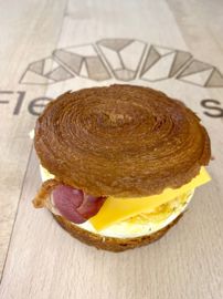 Vendredi 3 octobre, il pleut à Rennes et la boulangerie Fleur de sel en profite pour dégainer sa première collection de snacking chaud. À la carte : un hot dog sur une base de pâte à croissant, une brioche suisse à la fondue de poireaux et saumon, un croissant burger et un burg’œuf (ou egg roll) — soit un bun feuilleté garni d’un œuf au plat, sauce tartare, cheddar et poitrine fumée. Quatre références appétissantes et gourmandes qui reflètent l’identité et le positionnement singulier de la boutique, axés sur la boulangerie et la viennoiserie.